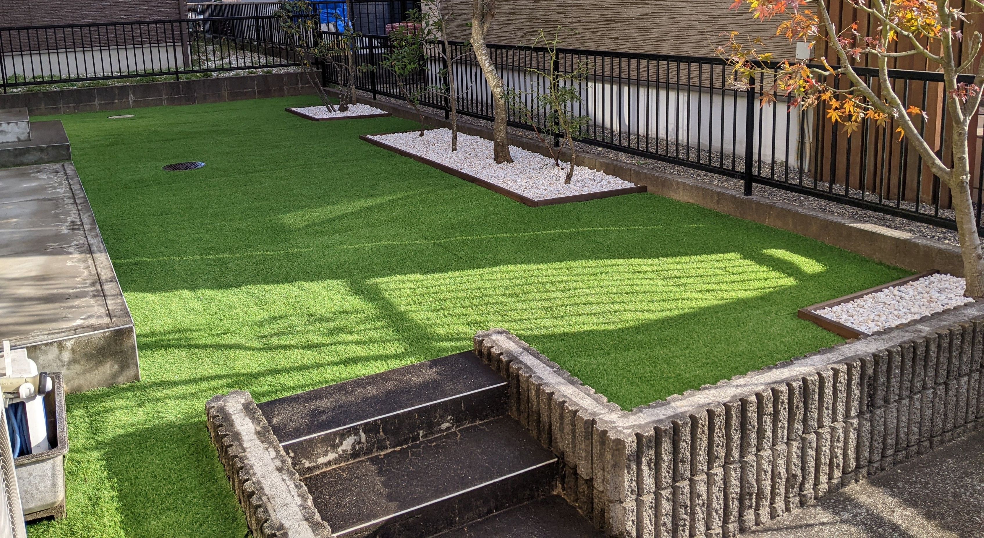 雑草が酷く、年に何回も草刈りをすることに疲れ人工芝へ。